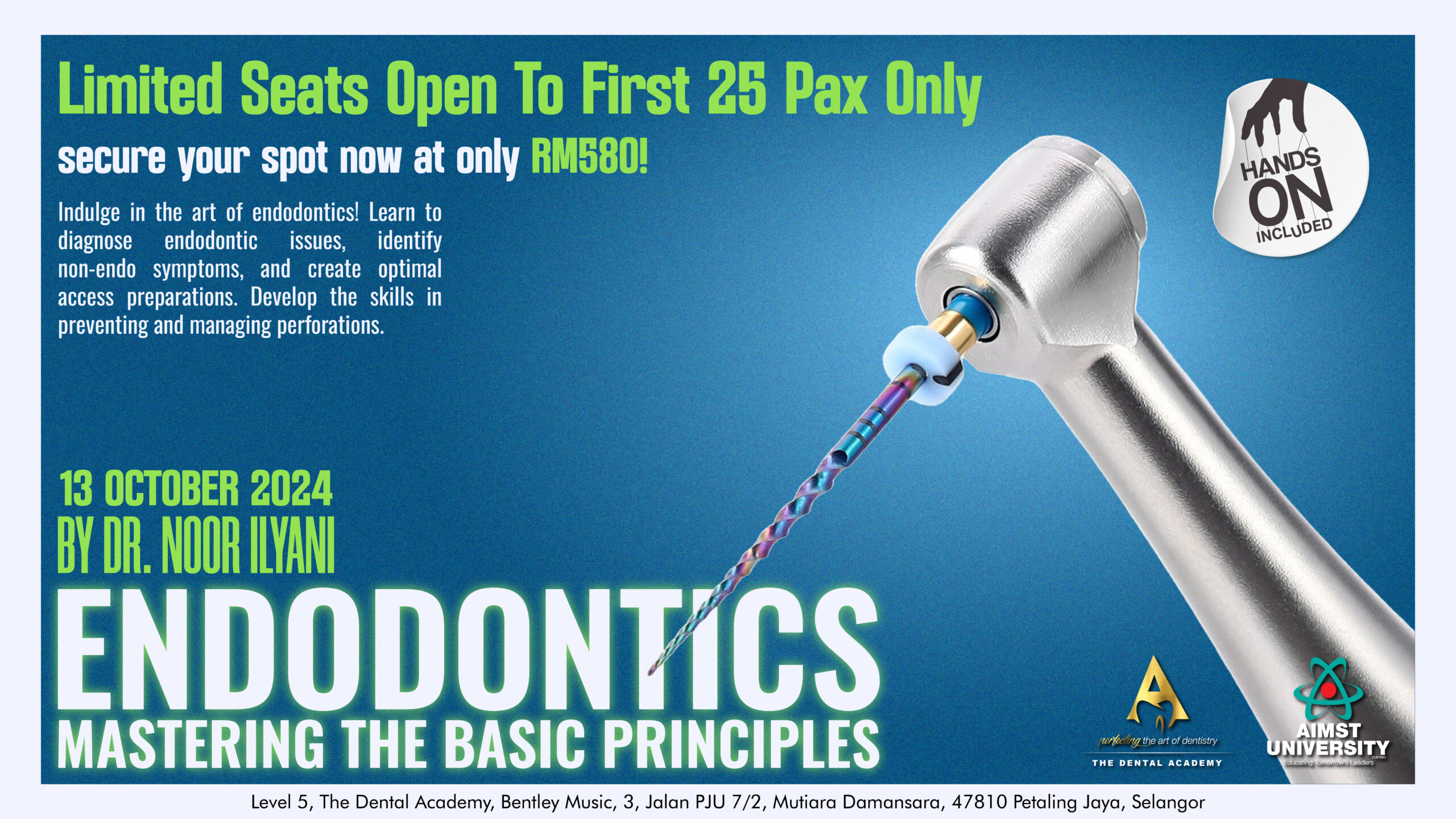 Should there be a need for cancellation or withdrawal from this course with a valid reason, kindly inform us by email at info@thedentalacademy.com.my, at least 30 days prior to the commencement of the course date.